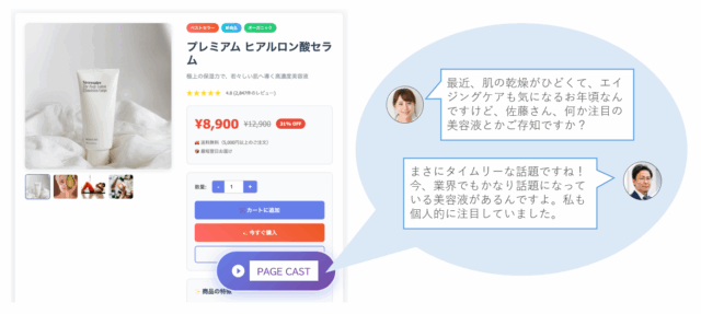 そこで今回、AI生成サービス「PAGE CAST」を導入することで、当社が得意としてきた“トークによる商品説明”を、より手軽に、そしてより多くのお客様にお届けできるようになります。さらに、生成されるトークの内容はディーブレスが監修し、今まで培ったノウハウを活かした分かりやすい説明を実現しています。