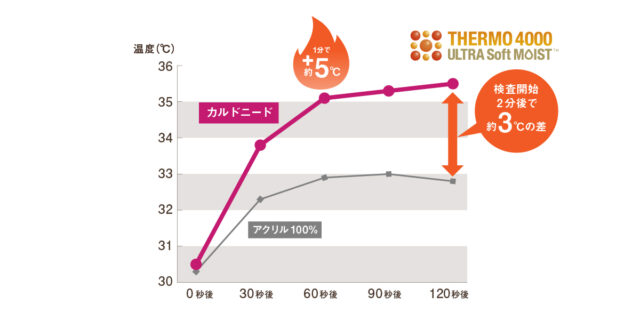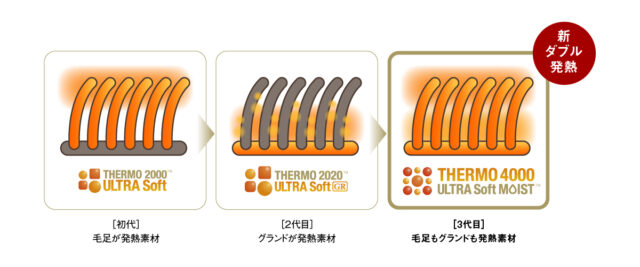 新たに搭載した”新ダブル発熱”素材「THERMO 4000 ULTRA Soft MOIST」により、使用開始から約1分で約5度の温度上昇を実現し、冬の暮らしに極上の暖かさと心地よさをお届けします。