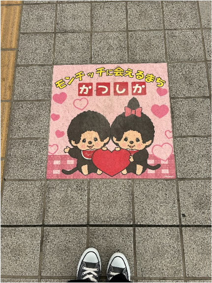 新小岩の駅でバス停を探していると、なんと道にモンチッチを発見!(もちろん踏みません)